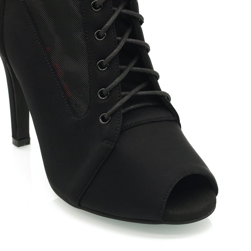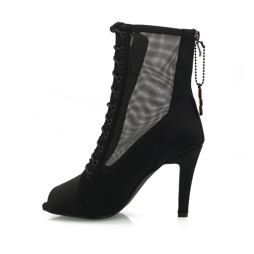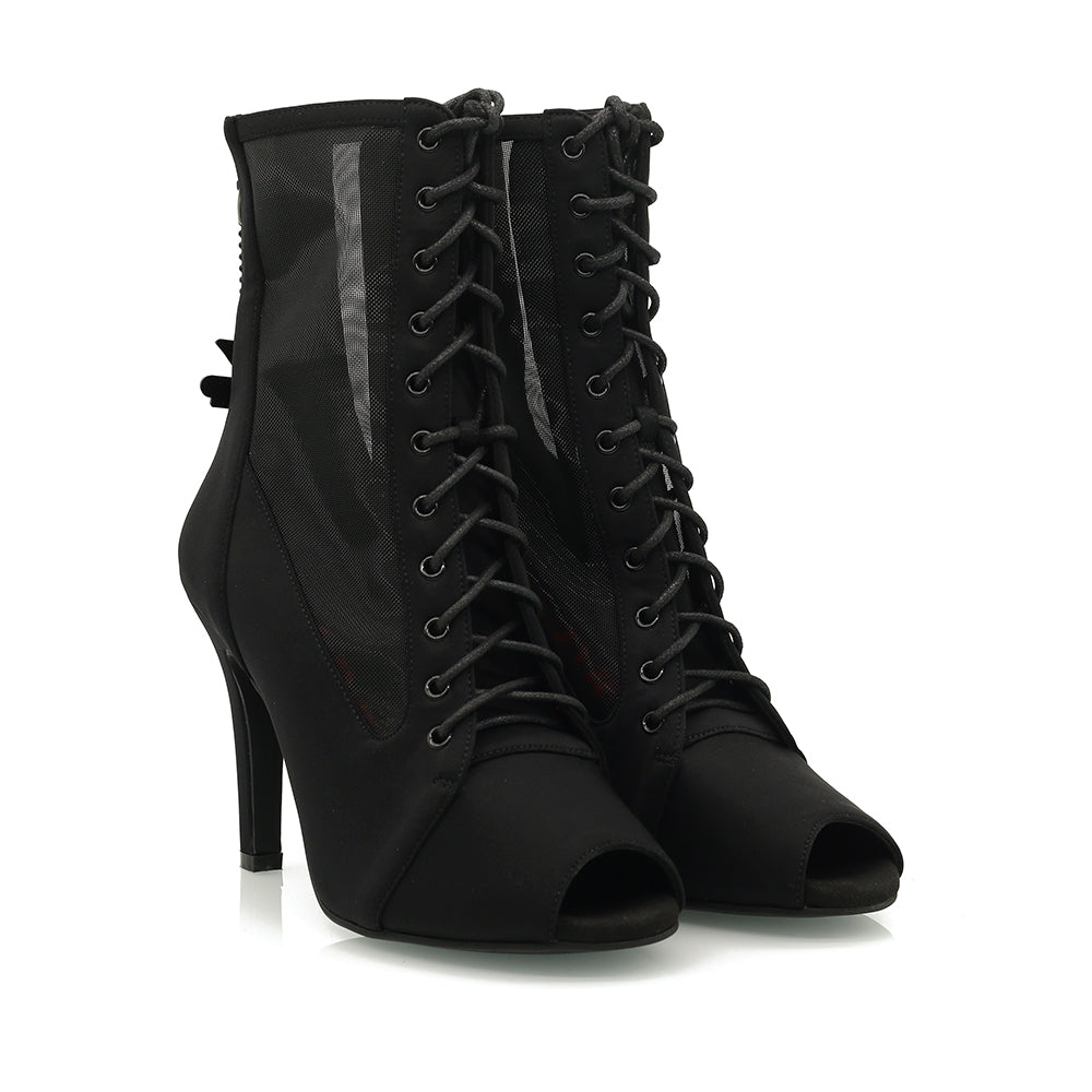 A vegan, lace-up, open-toe dance bootie designed with a customisable, lock-in fit, breathable mesh panels, and a secure 4" stiletto base.